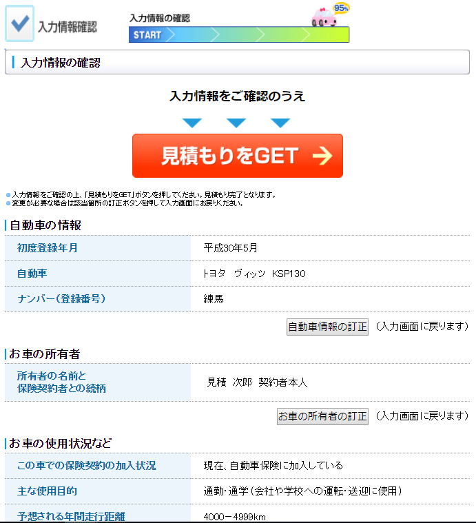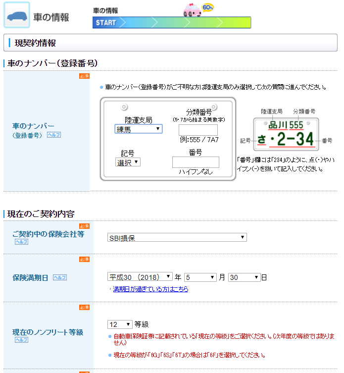 [車のナンバー・現在の契約内容・保険金の請求件数]の入力が必要なのですが、