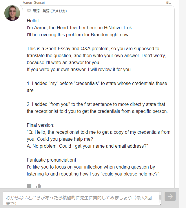 そんな時に、さっそくAaron先生という方からメールが届きました!
